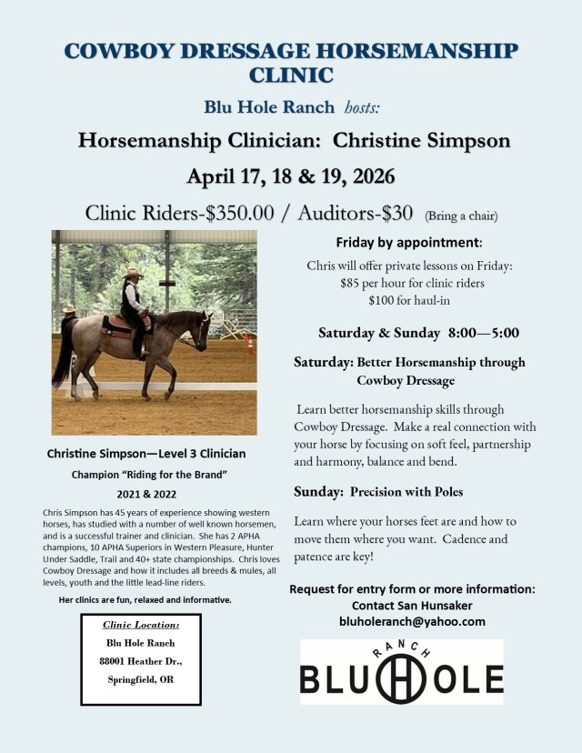 April 17, 18, 19, 2026 ~ Chris Simpson Cowboy Dressage/Horsemanship Clinic, BluHole Ranch, Springfield, OR